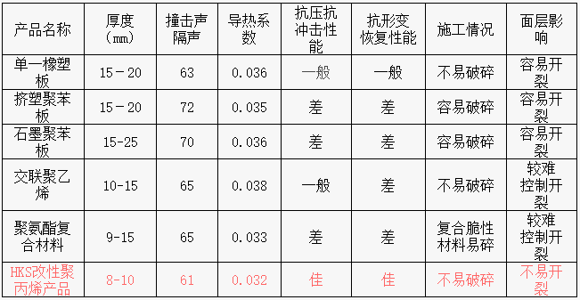 HKS改性聚丙烯保溫隔聲板與其他產品性能對比